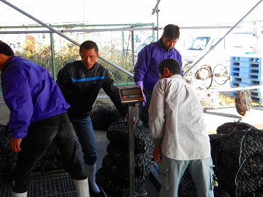 強風の為本来なら漁場で選別ですが、ほぼ全船港の入口にて選別をしています。